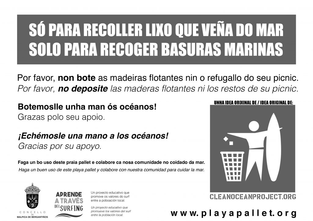 O seu concepto é simple, pero potente. A reciclar pallets que de outro xeito serían destruidos armamos un contenedor sinxelo. Queimamos a madeira para aumentar a súa durabilidade e colocamoslle un cartaz informativo, para que as persoas usuarias da praia acheguen, se así o dexesan, un anaquiño do seu tempo e un pouco da súa vontade para seren parte da solución. (Playa Pallet)